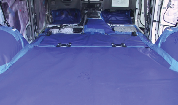 Composite armor is sealed to the entire floor of the vehicle. Designed to absorb bomb fragmentation, armor is concealed under the carpet and seats to maintain the original appearance of each vehicle.